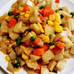 1. Prepare ingredients, dice lotus root and carrots, cook corn and green beans and set aside.