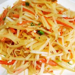 2. Cut the potatoes into shreds and soak them in water for a while.Shred the carrots and set aside.
