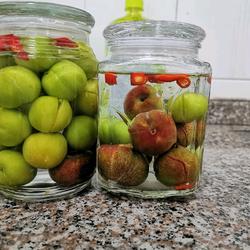 4. Remove the plums from the salt water (no need to wash them again), put them into the sugar water, and add the chopped peppers
