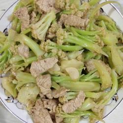 Cauliflower, meat ( 8 taels, 1 tael ) | Soybean oil, oil consumption, light soy sauce, salt, monosodium glutamate, pepper powder, water starch (appropriate amount) |