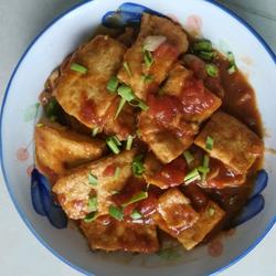 5.Put it out, put garlic in the pot, stir-fry until fragrant, add tomatoes, pour in the sauce prepared before, and pour in the fried tofu