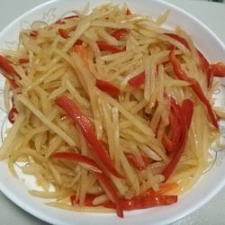 7. Stir-fry the shredded potatoes until shredded and add shredded red pepper.