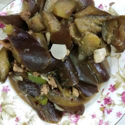 5. Heat oil in a pan, boil the oil, add onion, ginger and garlic, stir-fry until fragrant, add meat, stir-fry until white, add light soy sauce, oil, stir-fry, add eggplant pieces, Stir-fry until cooked, add pepper powder and chicken essence, then add a small amount of water, cover the pot, simmer over low heat until the juice is reduced, add salt, stir-fry evenly