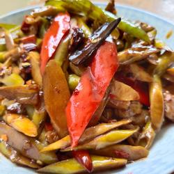9.After pressing, pour into the pot and add the prepared green and red pepper slices , stir-fry for one minute.