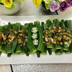 8. Pour the sauteed onion, ginger and garlic juice with a spoon and pour it on top of the okra.Simple boiled okra is ready.