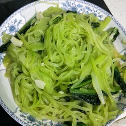 4. Heat the oil in a pan to 120 degrees, stir-fry the garlic until fragrant, pour in the prepared lettuce shreds and stir-fry over high heat for 6 minutes, add Stir-fry the salt and chicken essence for another minute