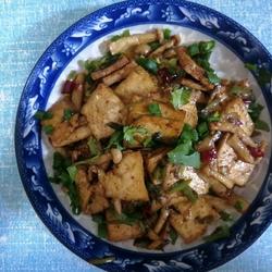 7. Pour in fried tofu slices and pour in chili pepper Noodles, pepper noodles, add dark soy sauce and salt, stir-fry evenly, take out of the pan and put it into a plate, sprinkle with chopped green onion