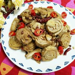 6. Add Sichuan peppercorns, ginger, garlic, and dried chili peppers to the base oil, saute until fragrant, and fry Quickly stir-fry the good Qianzhang tube together, pour in the juice prepared previously, cook over high heat to quickly dry up the water, and season with salt before serving.