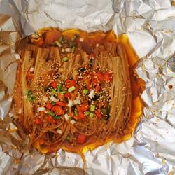 3.Tear the enoki mushrooms into pieces and lay them flat on tin foil and pour the sauce on them