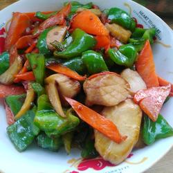4. Add the green pepper slices and stir-fry for ten seconds.
