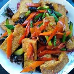 5. Stir-fry for one minute and then add the fried tofu, fungus, carrot and cucumber slices , add salt, dark soy sauce, and seasoning in advance because tofu is difficult to taste.