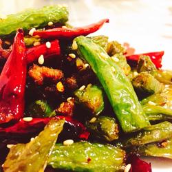 7. After the minced meat is cooked, add dried chili peppers, onions and garlic, and stir-fry red chili peppers.Oil