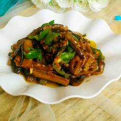 5.Marinated eggplant Squeeze out the water, put it into the oil pan and stir-fry until soft.Add two tablespoons of bean paste and stir-fry.