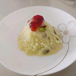 11. Prepare a plate, wait for the mashed potatoes to cool in the bowl, sprinkle the plate with pendant dried fruits And half a spoonful of jam is enough.