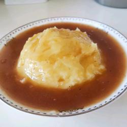 4. Pour a small amount of milk into the steamed potato slices and press them into puree., then pour the sauce on it and that’s it! Perfect! ! !