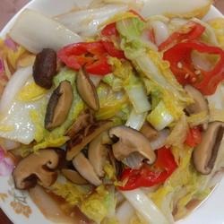 2. Saute the mushrooms and red pepper and add the baby cabbage.After sautéing until fragrant, add salt, oyster sauce and light soy sauce.