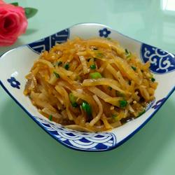4. Heat the oil in a pan, add shredded radish and stir-fry, add June fresh white soy sauce, water