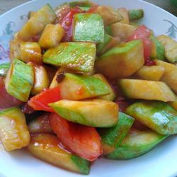 3. When the oil is 70% hot, add onions, ginger and garlic.After frying until fragrant, add the gourd and add a little sugar.