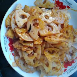 3. Saute onion, ginger and garlic until fragrant, add lotus root slices, stir-fry twice and then add half a spoonful white sugar.