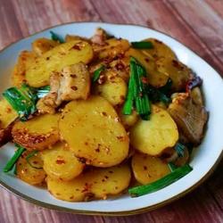 Potatoes, pork belly 400g ( 2 pcs ) | Edible oil, oyster sauce, salt and MSG, dried chili pepper, chili powder, garlic sprouts (appropriate amount) |