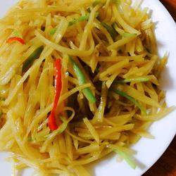 3. Heat oil, sauté garlic until fragrant, add shredded potatoes, salt, oil, soy sauce, thirteen spices, chicken essence and stir-fry until cooked, add green and red peppers, stir-fry before serving Plate