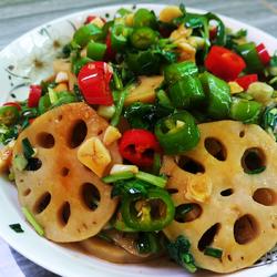 6. Add minced garlic to the drained lotus root slices , coriander, chives, green and red pepper rings.