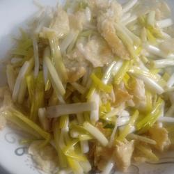 3. Add shredded onion and garlic slices and saute until fragrant.Pour in the chives.