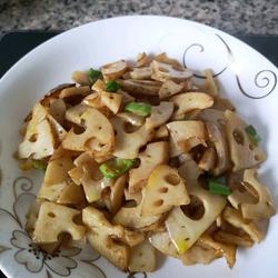 2. Heat the oil and add the lotus root slices, stir-fry evenly and add Pour in a little water, add sweet and sour salt chicken essence and light soy sauce