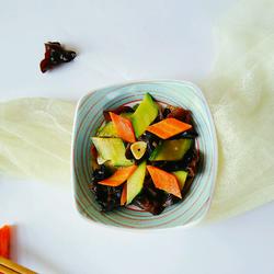 5.Add carrots and stir-fry for a few times, add fungus and stir-fry,