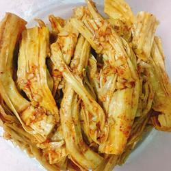 3.Pour oil into the pot, stir-fry the chili, garlic and spices until fragrant, add the yuba, add soy sauce, chili powder, and stir-fry