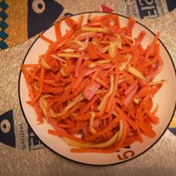3.Put the carrots into the pot and stir-fry until the carrots become soft.Then add a little vinegar.Continue to stir-fry.