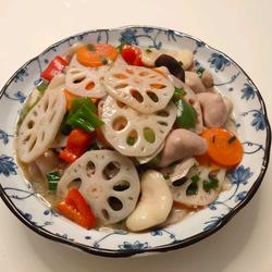 4. Boil the oil in a pan and add lotus root slices, carrot slices and water chestnut oil.Stir it up