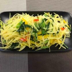 5.Add oil and heat, add shredded potatoes and stir-fry over high heat