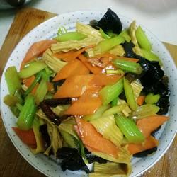 The fungus and yuba are soaked in boiling water in advance, and celery and carrots are easy to cook, so when frying, fry them quickly over high heat and add a few drops of sesame oil to make them taste better.